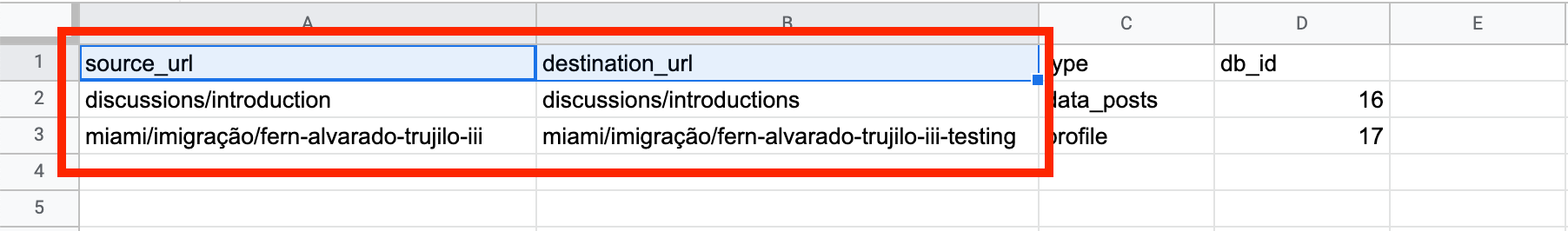 Create a CSV file containing each redirect to be applied. At minimum, this file must include two columns: