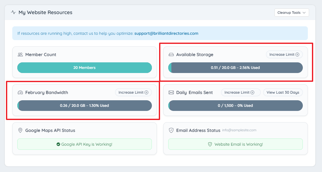 In the Dashboard Area of every Brilliant Directories website, there is an indication of the storage that is currently being used and the bandwidth that has been used for the current calendar month: