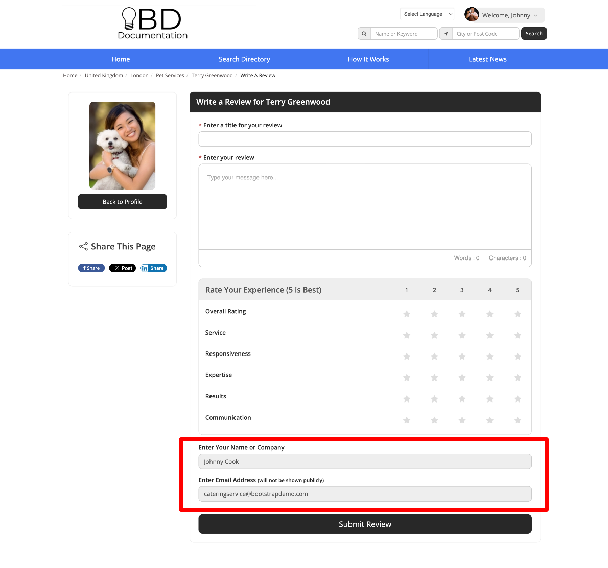 Members can leave reviews on profiles by clicking the “Write a Review” button. This feature allows users to share their experiences and feedback directly on the member’s profile. It will display within their profile and search results page.