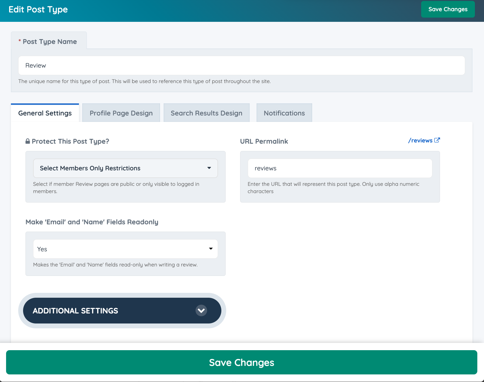 Here are the general settings for the post type, allowing the admin to configure and customize the reviews.