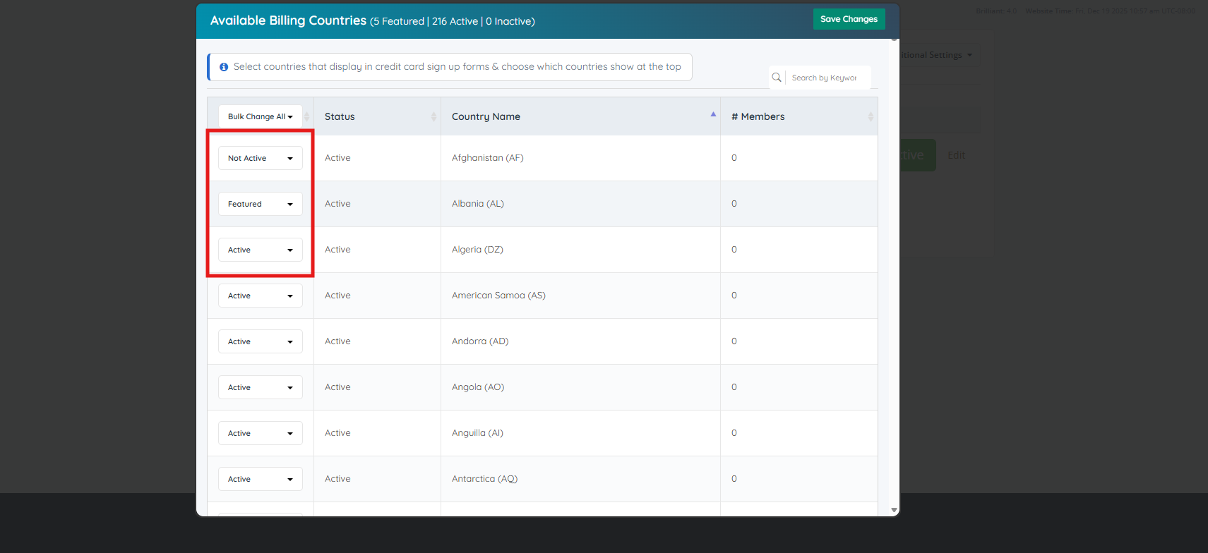 It will open this new page where the Active, Featured and Not Active Countries can be selected:
