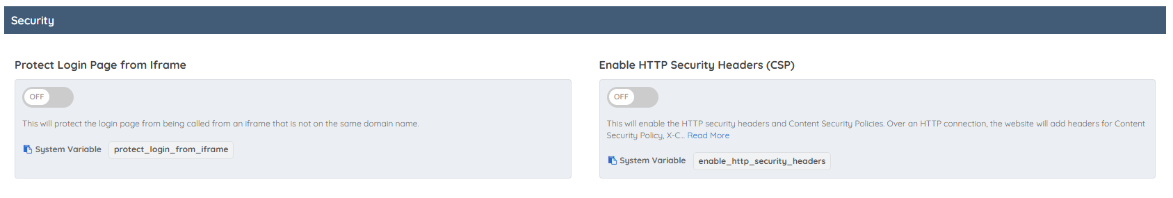 This section highlights important security settings designed to protect the website and its users.