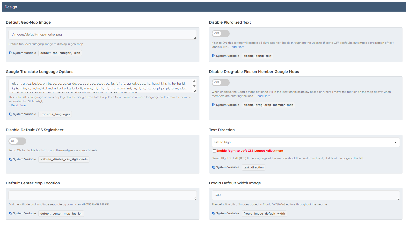 This section covers various configuration and localization settings for the website’s front-end experience.