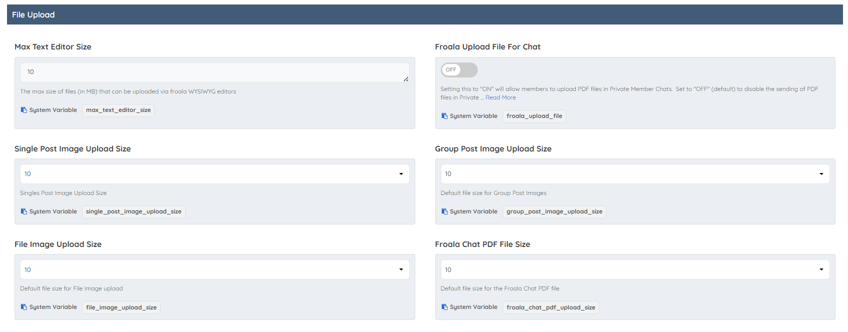This section outlines file size limits for uploads across different features, including the maximum file size for the Froala text editor, image uploads for single and group posts, file uploads, and PDF files shared in private member chats.