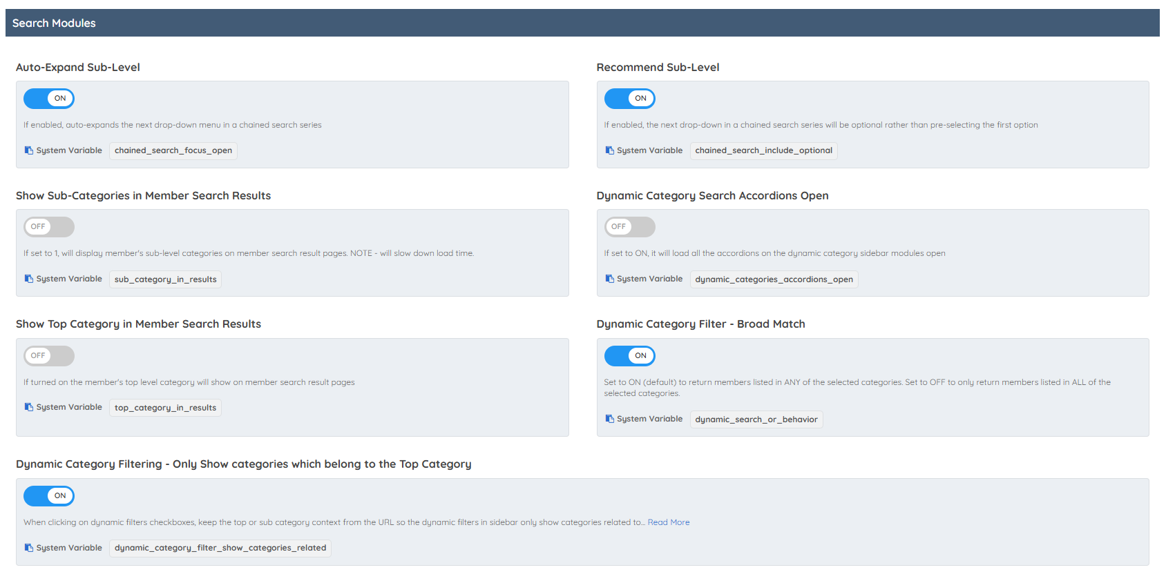 This section offers settings to customize how categories and filters behave in member search results.