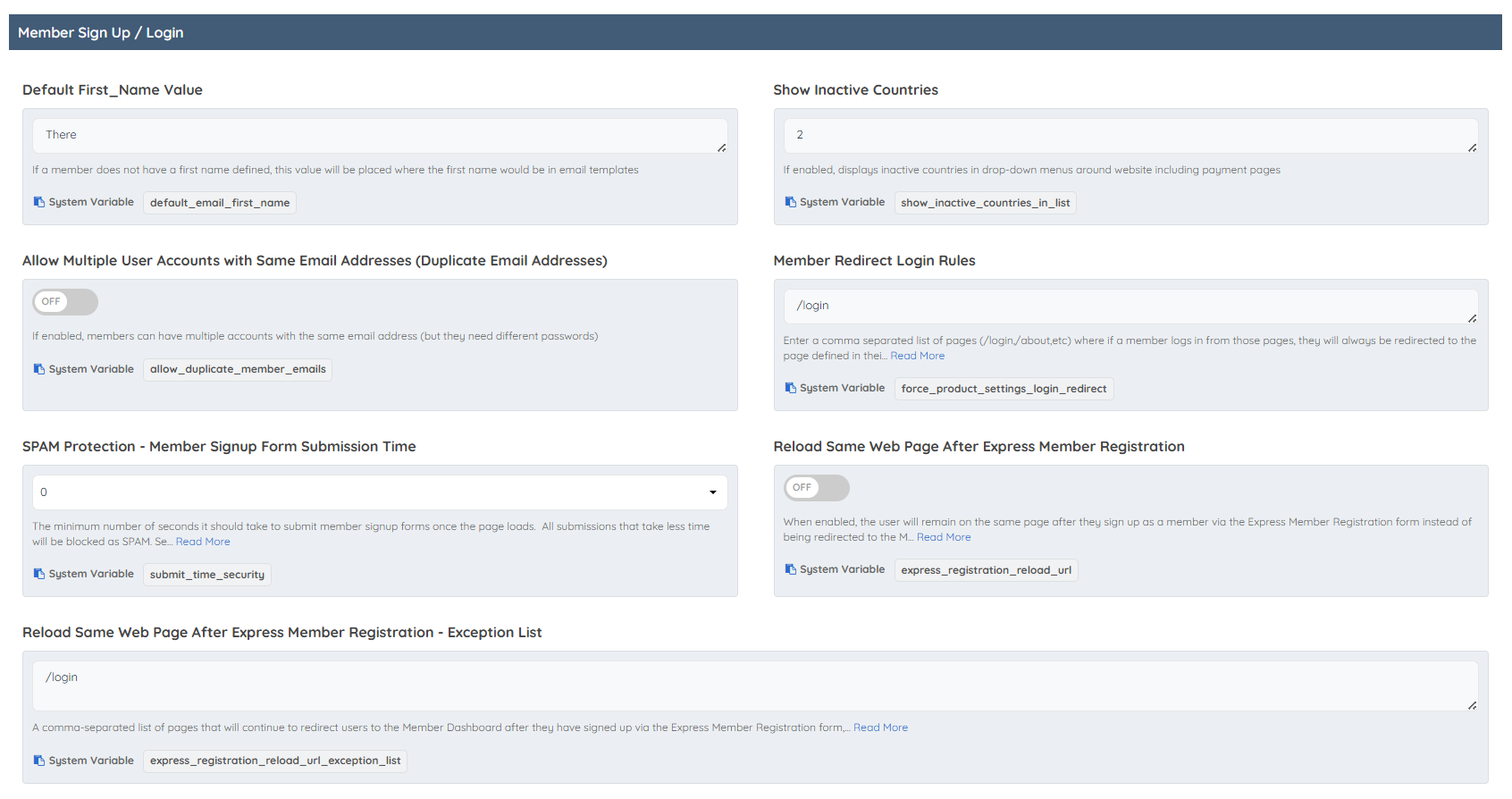The System Variable and Default Values for each Advanced Setting are displayed below the setting description.