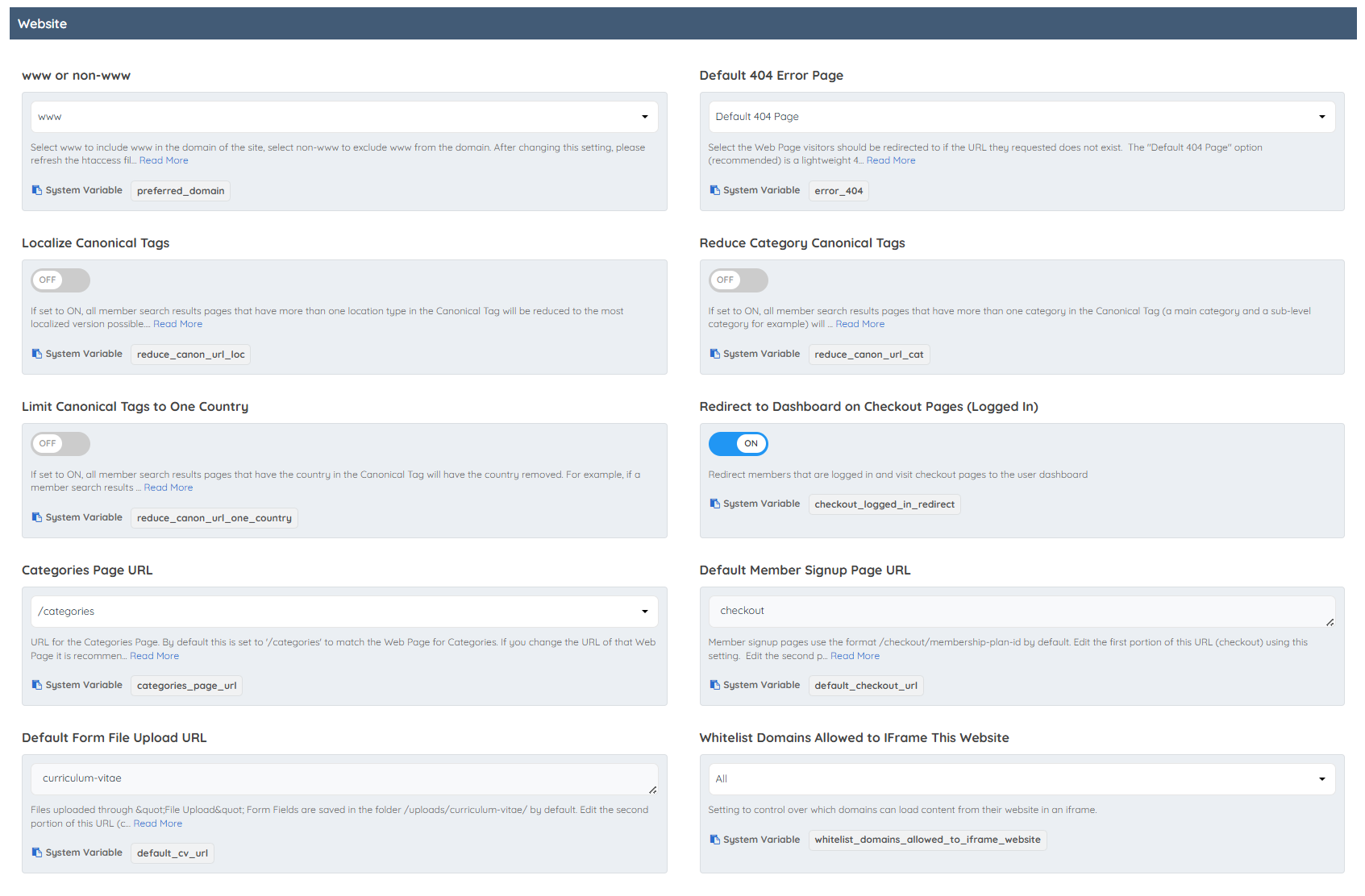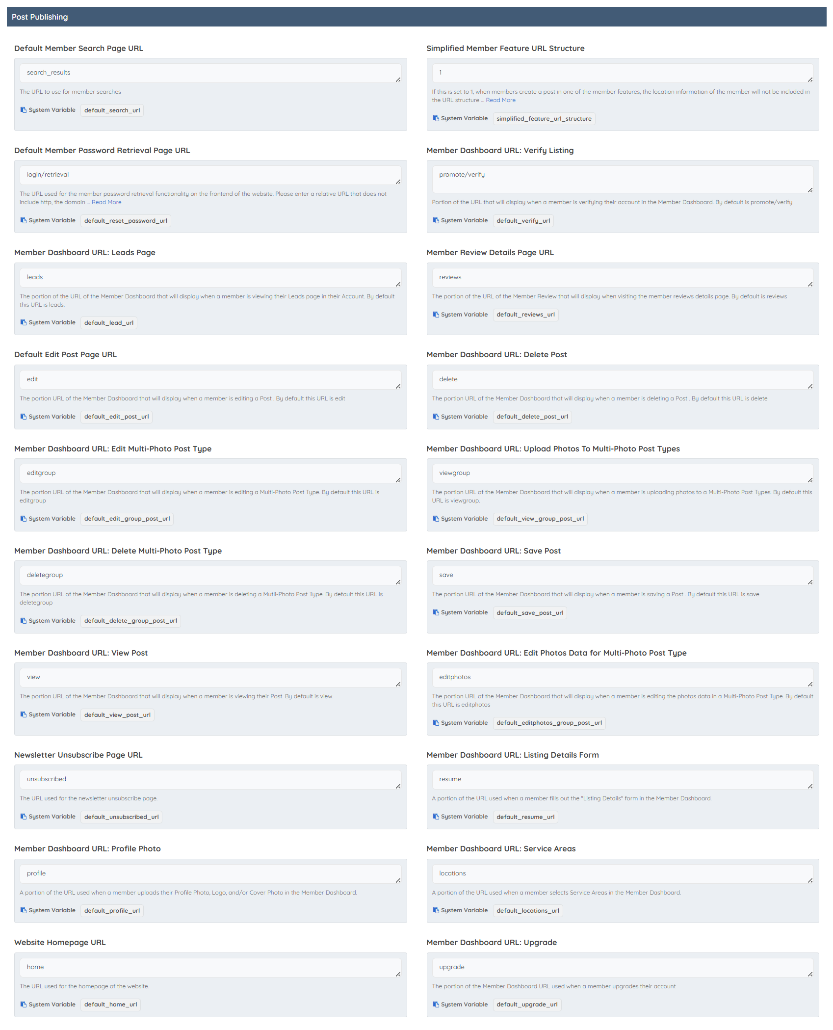 This section outlines essential website configuration settings that govern how the site's URLs, member profile pages, dashboard, and publishing features are structured and managed. These settings are organized into the following categories:
