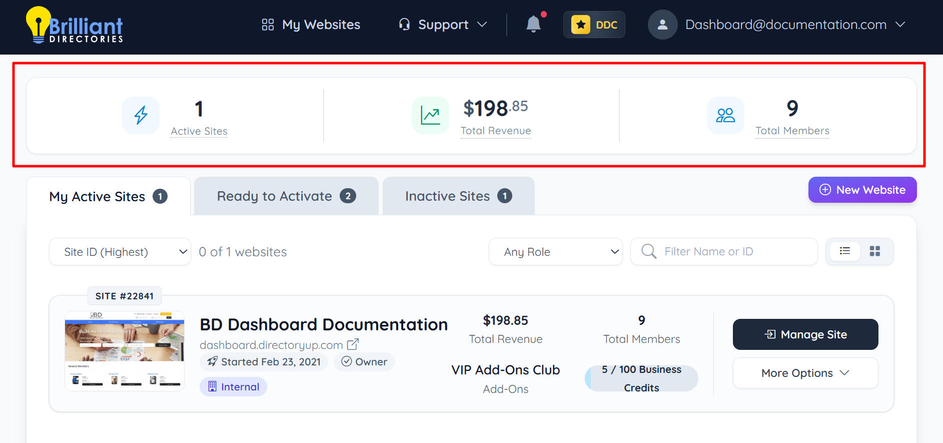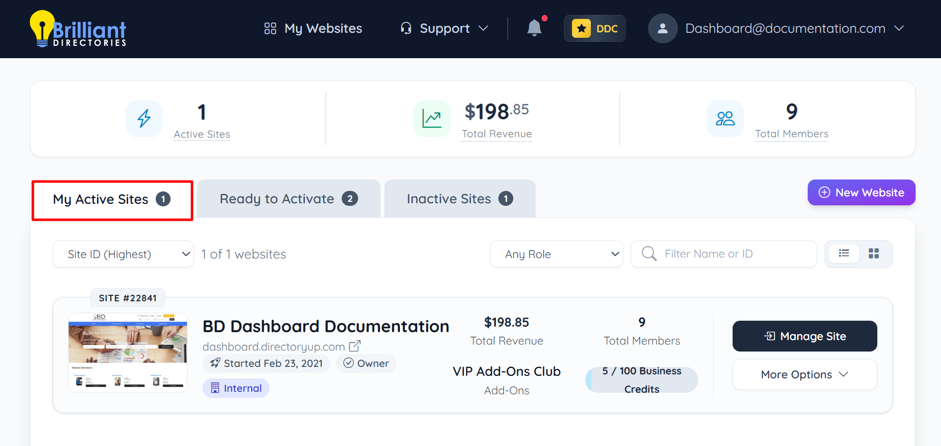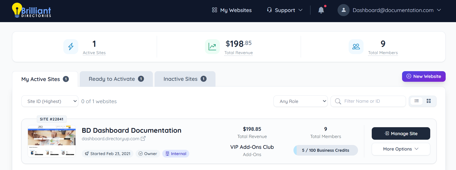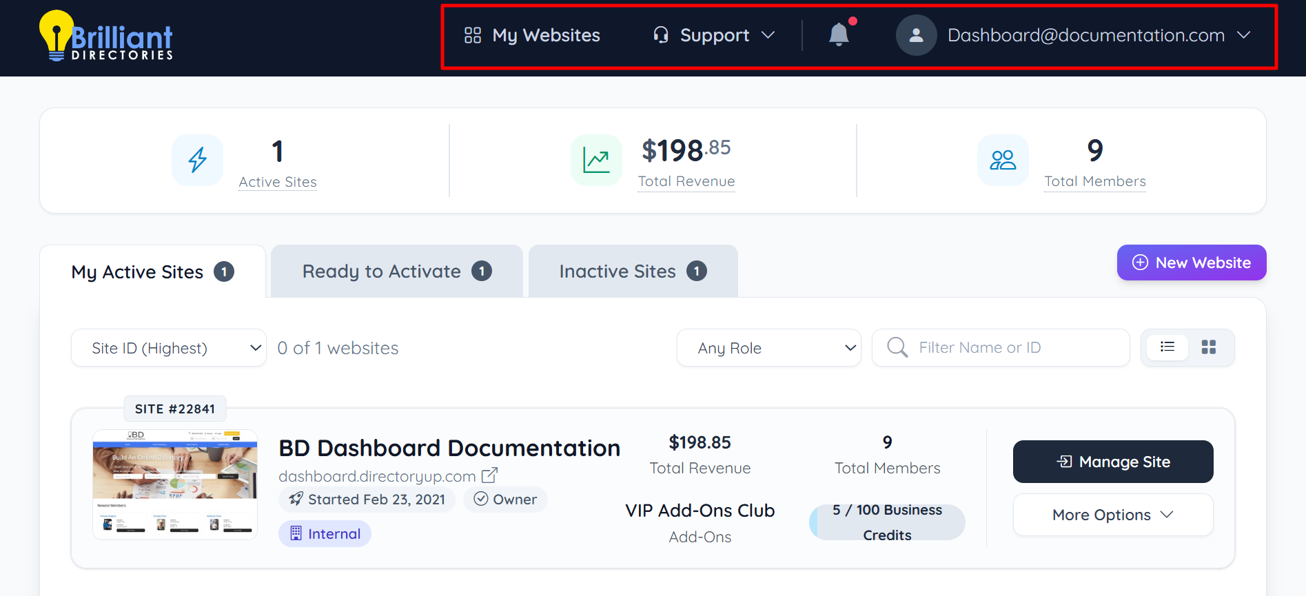 Selecting My Websites redirects to the main Account Dashboard page. This page displays all associated websites and provides options to manage, activate, or create new sites.