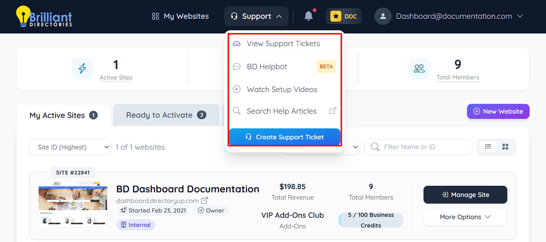Selecting the Support button opens a dropdown menu with access to support resources and assistance options. The menu includes links to view support tickets, use the BD Helpbot, watch setup videos, search help articles, or create a new support ticket.