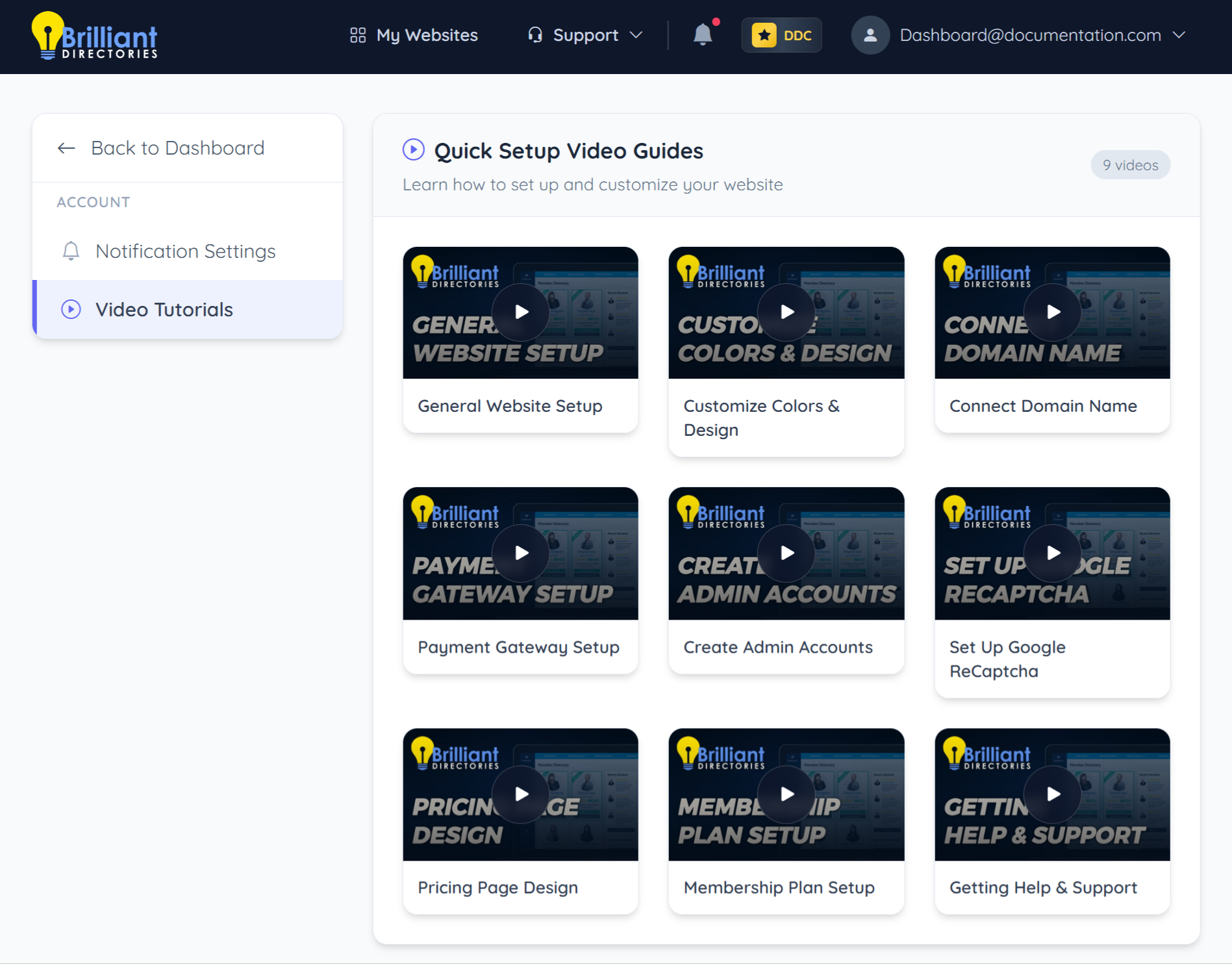 Selecting Quick Setup Video Guides opens a page featuring step-by-step tutorial videos for setting up and customizing a website. The page provides organized video resources covering topics such as design, payments, membership plans, and general configuration.