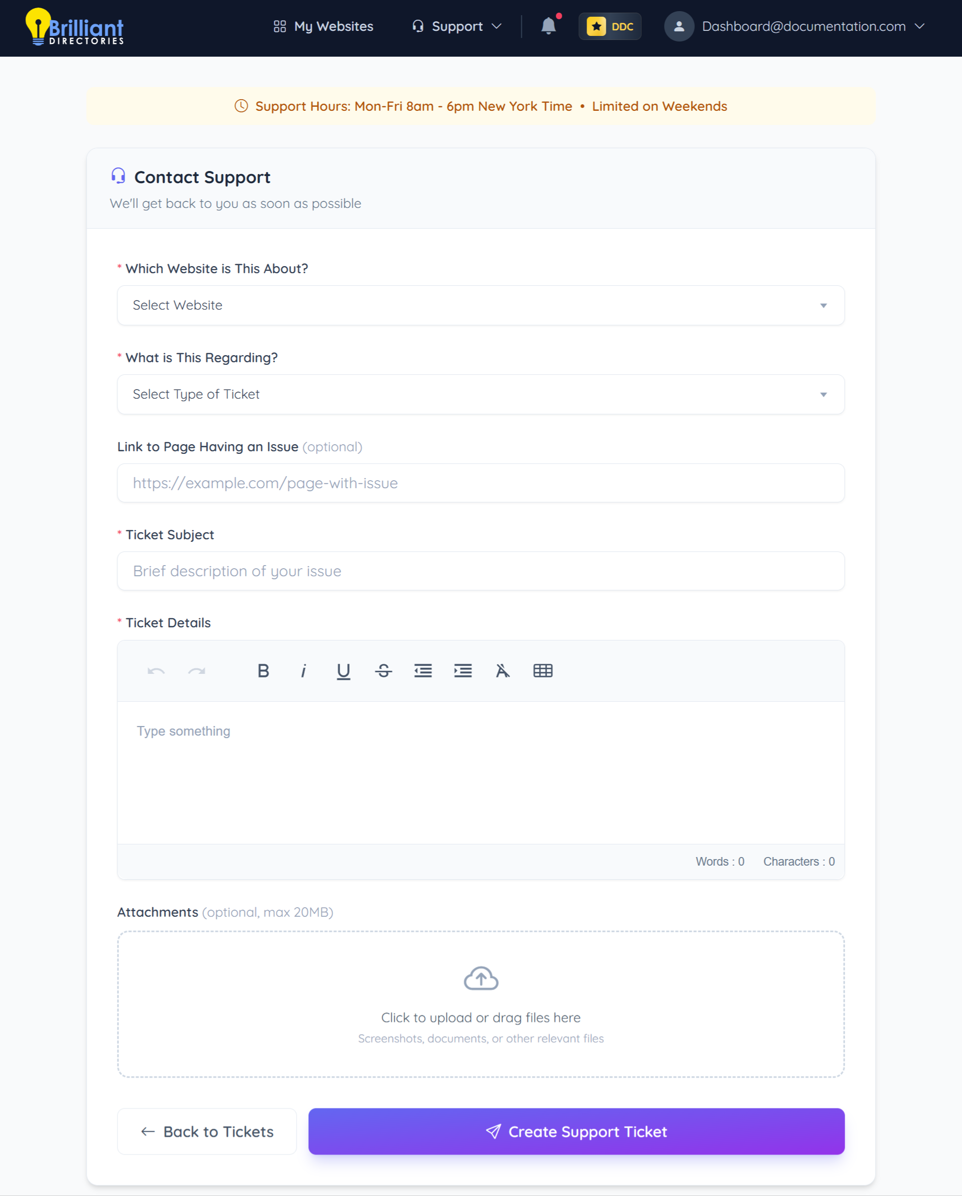 The Create Support Ticket page displays a contact form to submit a new support request. It includes fields to select the website, choose a ticket type, enter a subject and details, and optionally attach files before submitting the ticket.