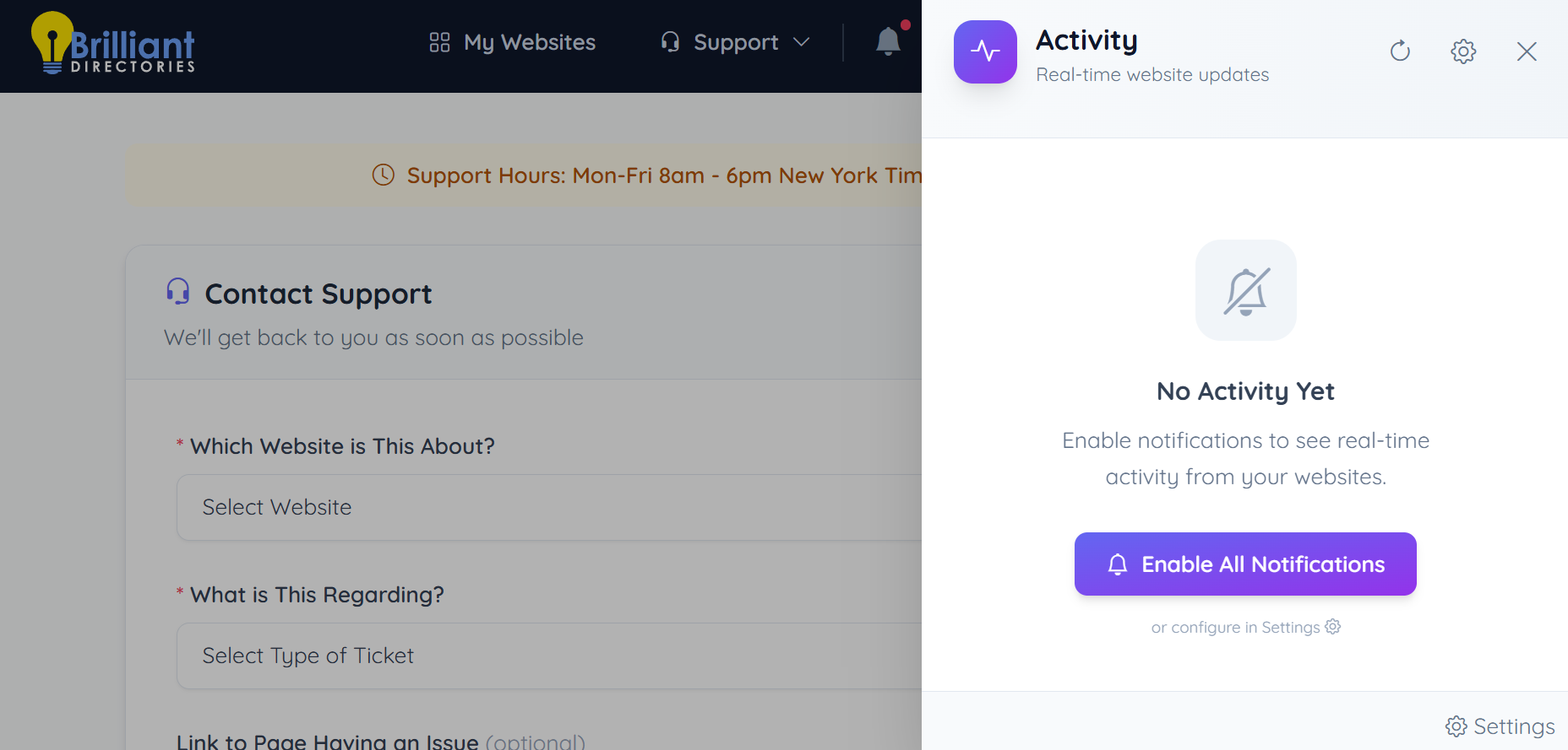 Selecting the Activity Bell icon opens a side panel displaying real-time website updates and notifications. If no activity is available, the panel provides an option to enable notifications or configure settings.