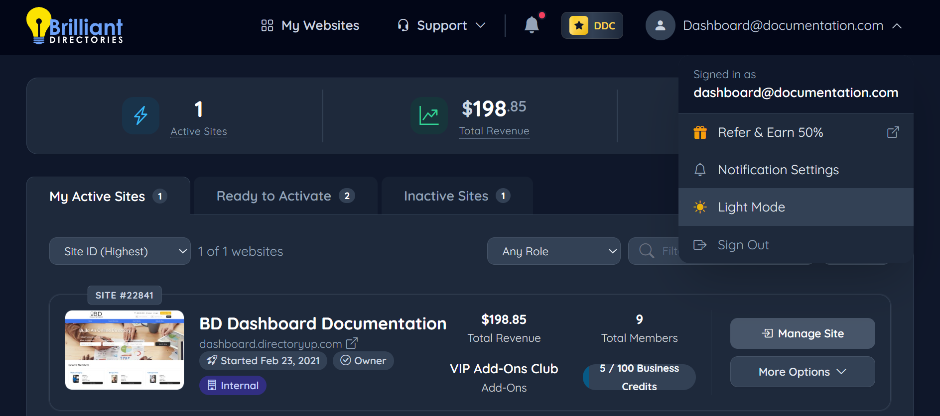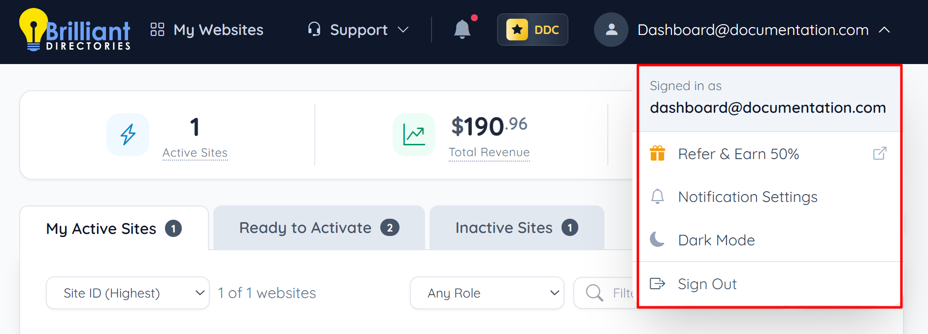 Selecting the account email (Signed in as dashboard@documentation.com) opens a dropdown menu with account-related options. This menu provides access to referral settings, notification preferences, dark mode, and the option to sign out.