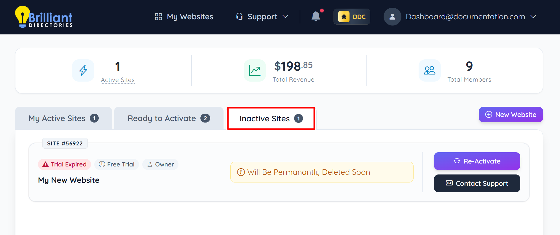 Selecting Inactive Sites displays websites that are currently not active. This section provides options to re-activate eligible sites or contact support if needed.