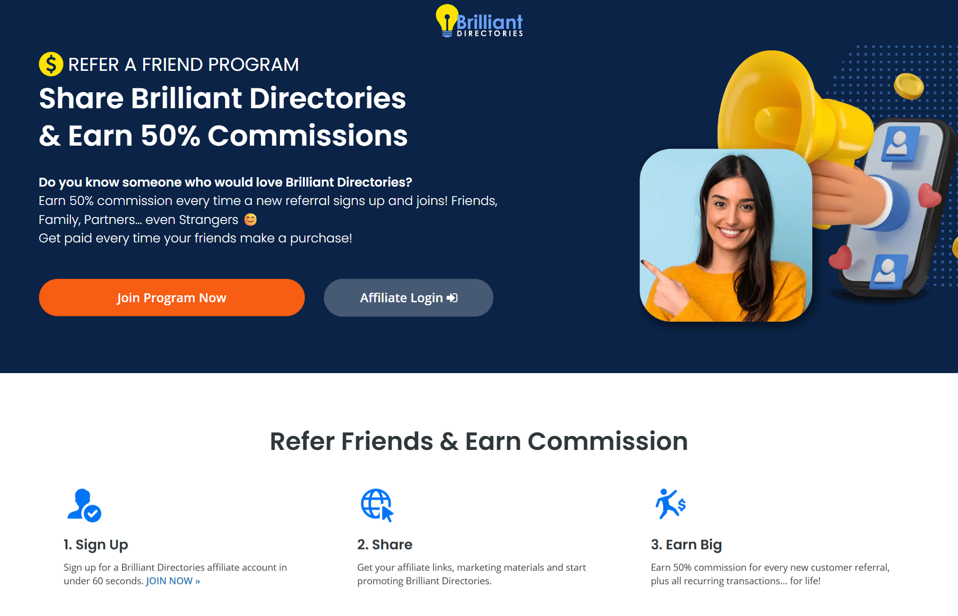 Selecting Refer & Earn 50% redirects to the Referral Program page. This page provides details about earning 50% commissions, explains how the program works, and includes options to join the program or access the affiliate login.