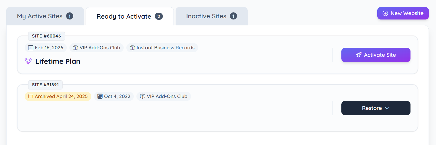 If there is more than one license purchased, but they're not yet activated, these will display right under Websites to Activate.