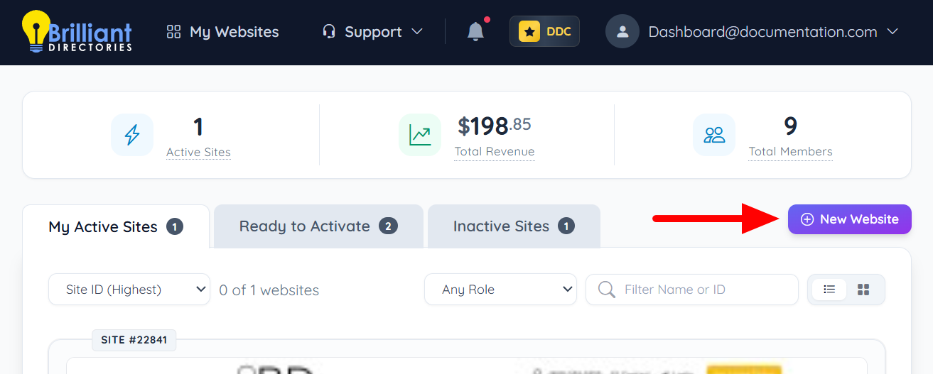At the top right corner, there will be an option button to "View My Websites". Alternatively, click on the "Manage Websites" link.