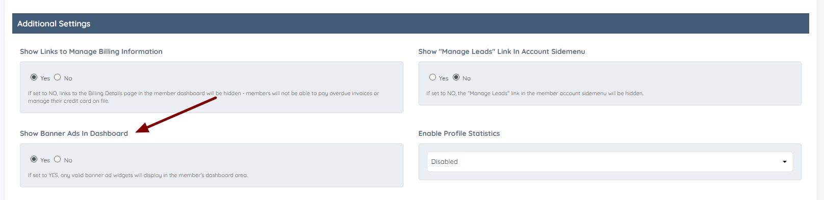 Then scroll down to the "Additional Settings" section >> Show Banner Ads in Dashboard":