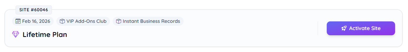 Add-Ons Indicators – Displays active add-ons associated with the website (e.g., VIP Add-Ons Club, Instant Business Records).