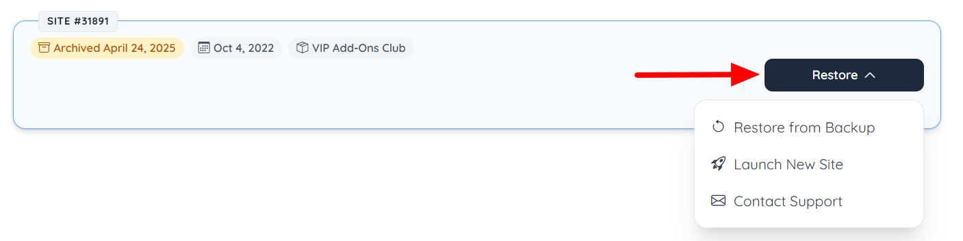 Status Label – Displays the current site status (e.g., Archived) along with the archive date when applicable.