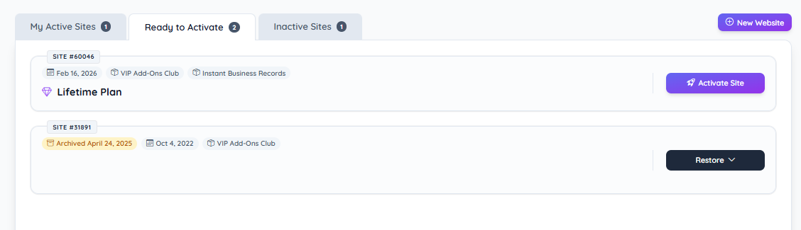 Inactive / Archived Sites Section – Displays websites that are not currently active and require activation or restoration.