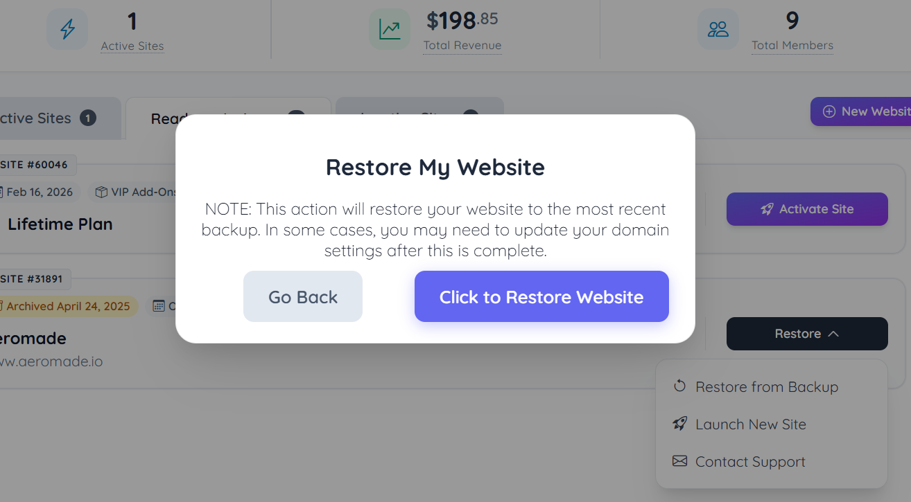Activate Site Button – Initiates the site activation process for websites eligible for activation (e.g., Lifetime Plan sites).