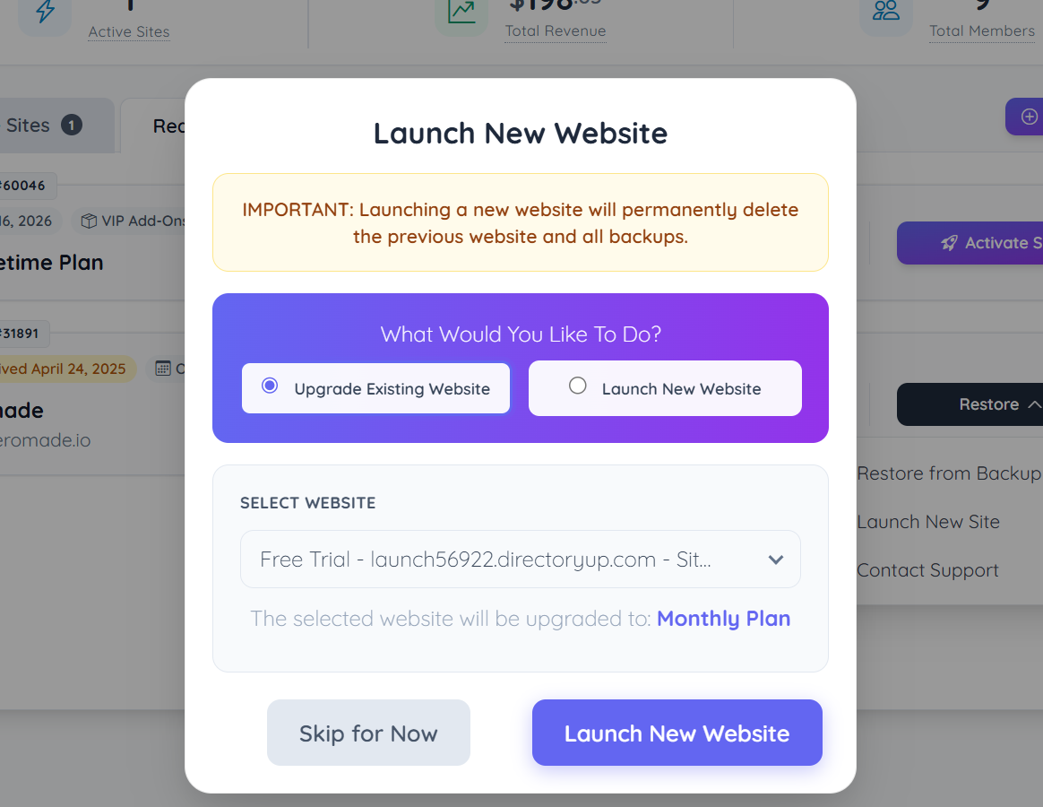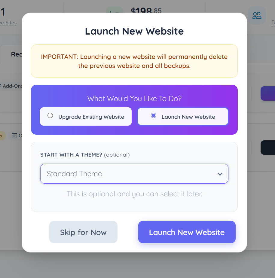 Choosing this option will delete the backup of the previous website and launch a brand new website. Select this option if the previous site is no longer needed and a brand new website should be launched instead.