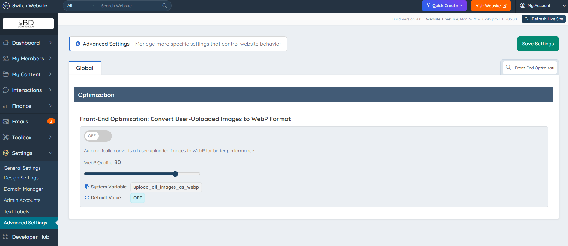When enabled, images uploaded through the member dashboard (such as profile photos, logos, and post images) are converted to WebP and compressed based on the selected quality level (default: 80%).