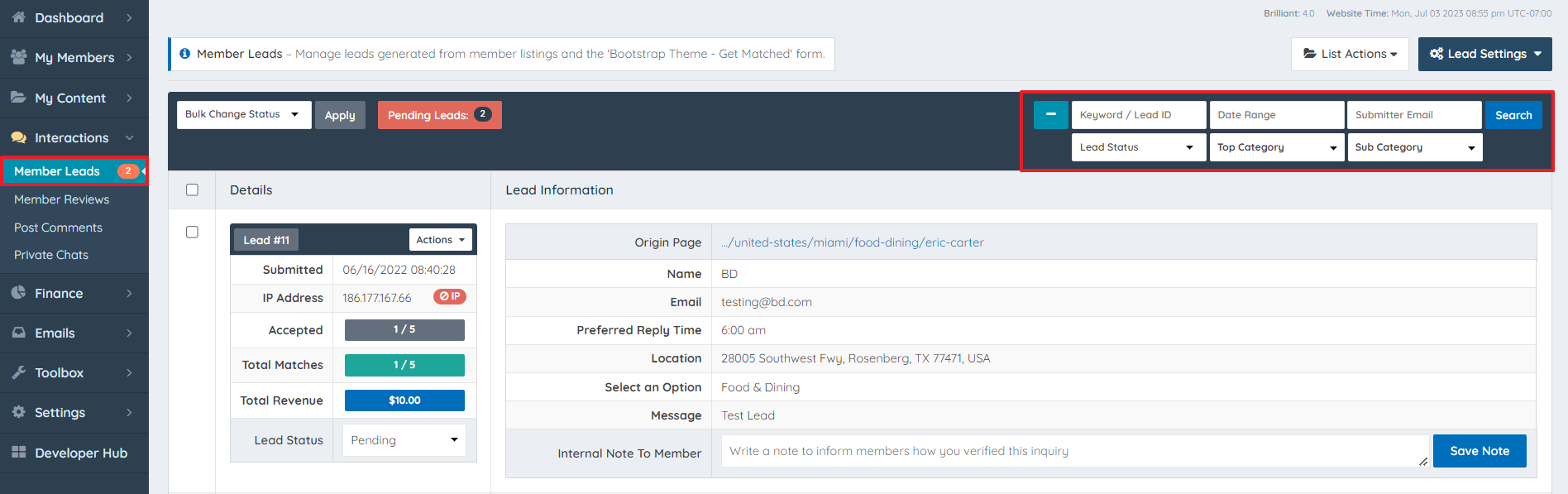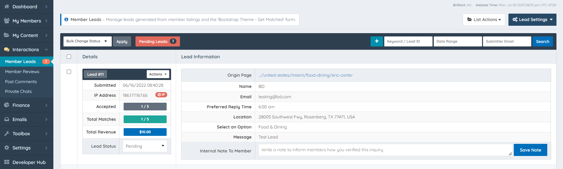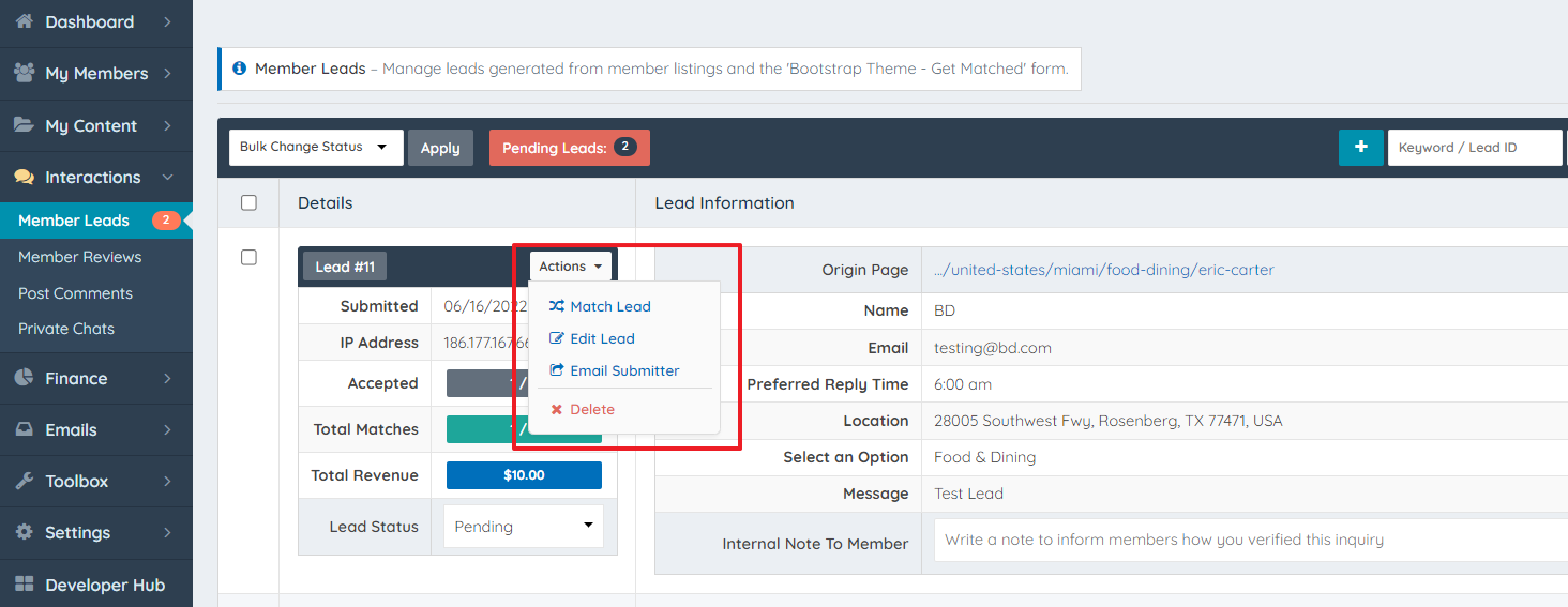 • Internal Note To Member: As an admin, there is an option to add a note for the member regarding the specific lead.