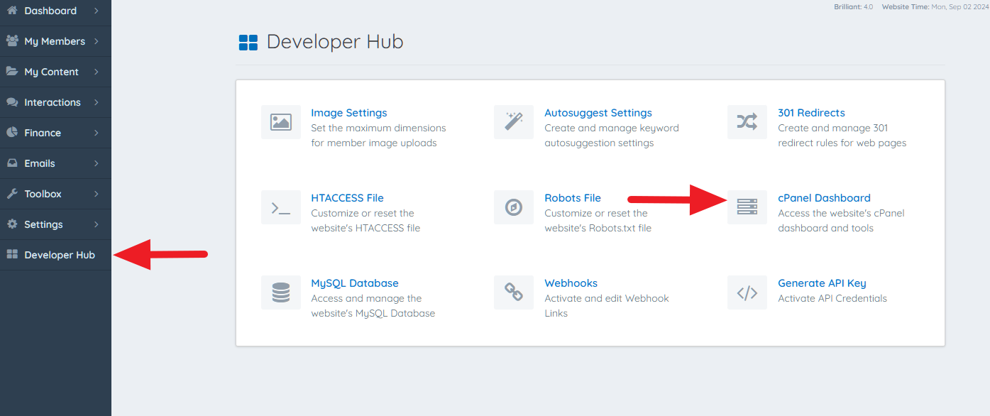 - In the Admin area of the website, navigate to the Developer Hub > cPanel Dashboard to log into your cPanel