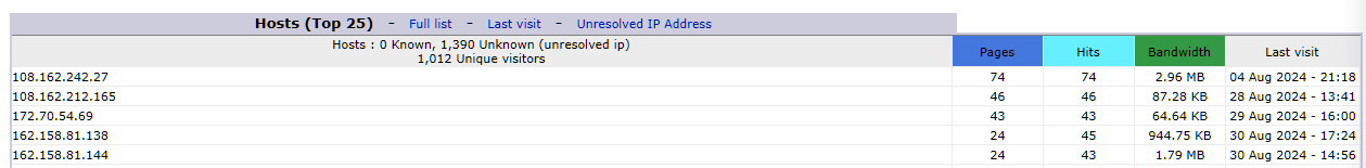 This is a list of IP addresses that have accessed the site. This can help identify the specific IPs, companies, organizations, or internet service providers (ISPs) consuming bandwidth on the site.