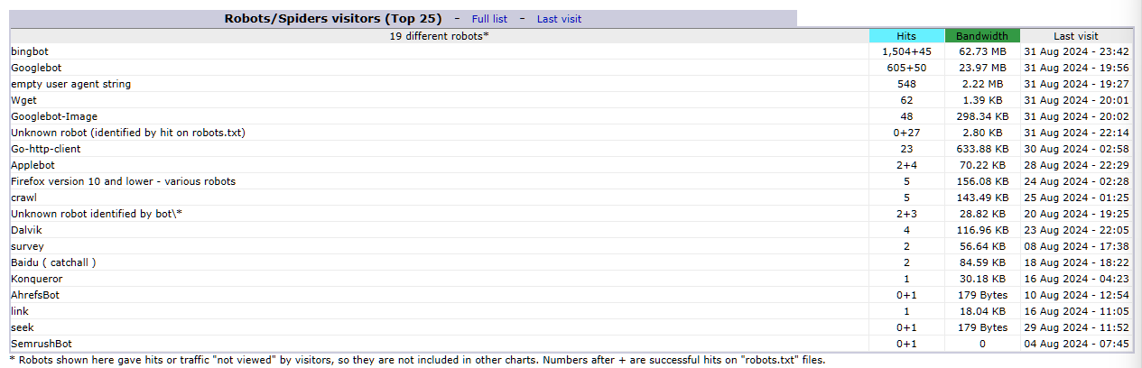 This section shows the "user agent" of bots that have visited the site, and how much bandwidth has been consumed by each bot.