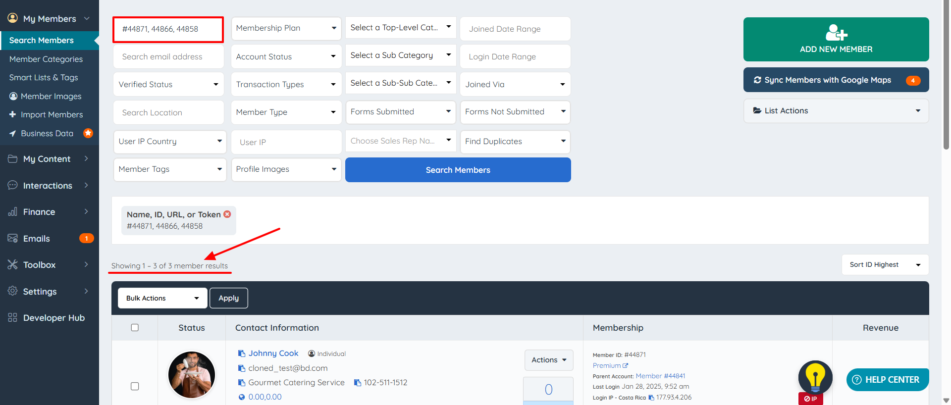 The Member Name, ID, or URL filter allows to search for multiple member IDs simultaneously. To do this, add a # to the search query, followed by a comma-separated list of member IDs. (see screenshot)