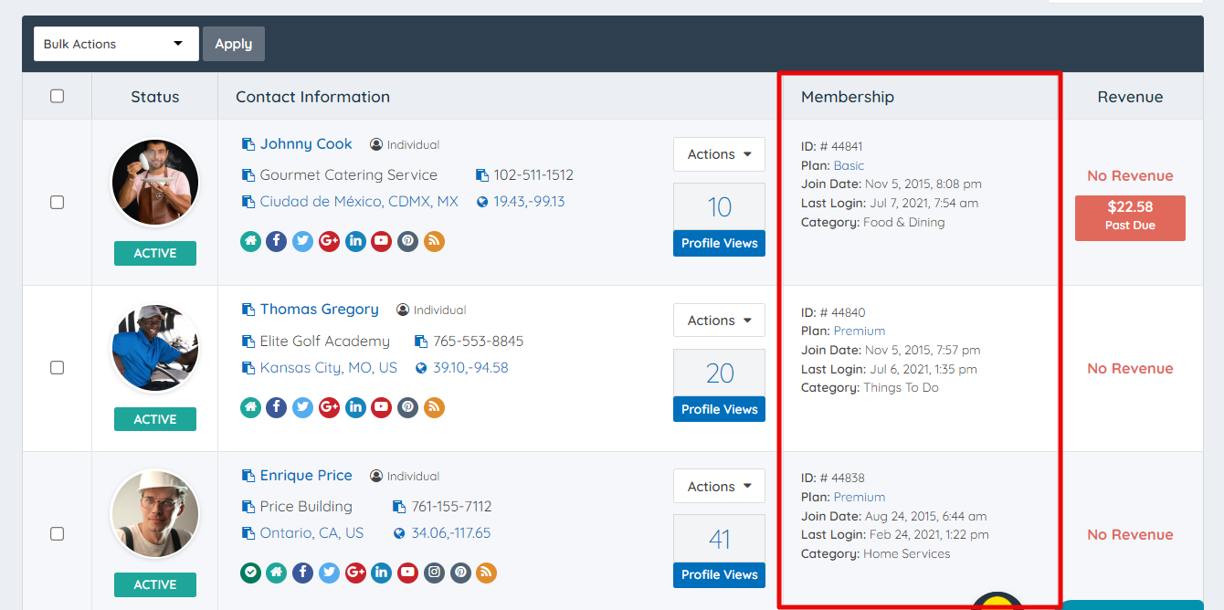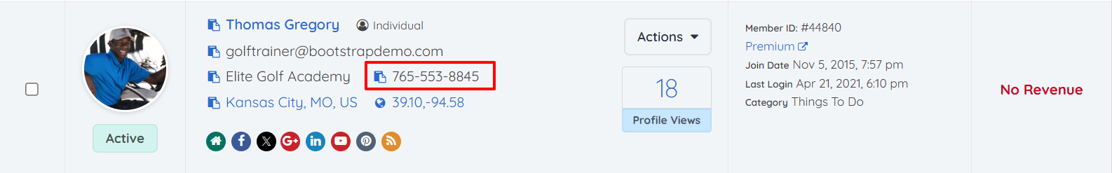 This section provides details about the member's contact information, including their name, listing type, email, phone number, location, and social media accounts.