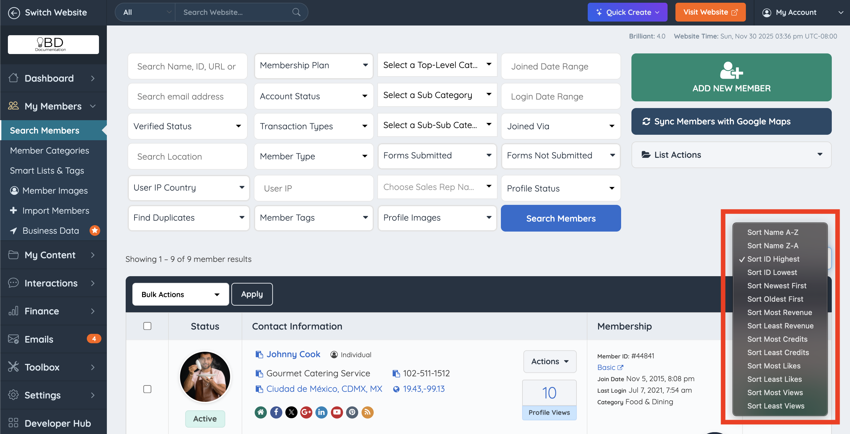 The sorting options enable organizing the member results table based on various attributes.